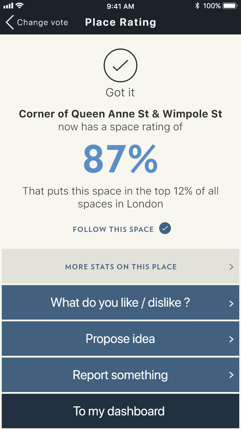 With the CityChange app — and the accompanying web platform — users get a voice, with the incentivising reward of instantly being able to compare their views to those of others.